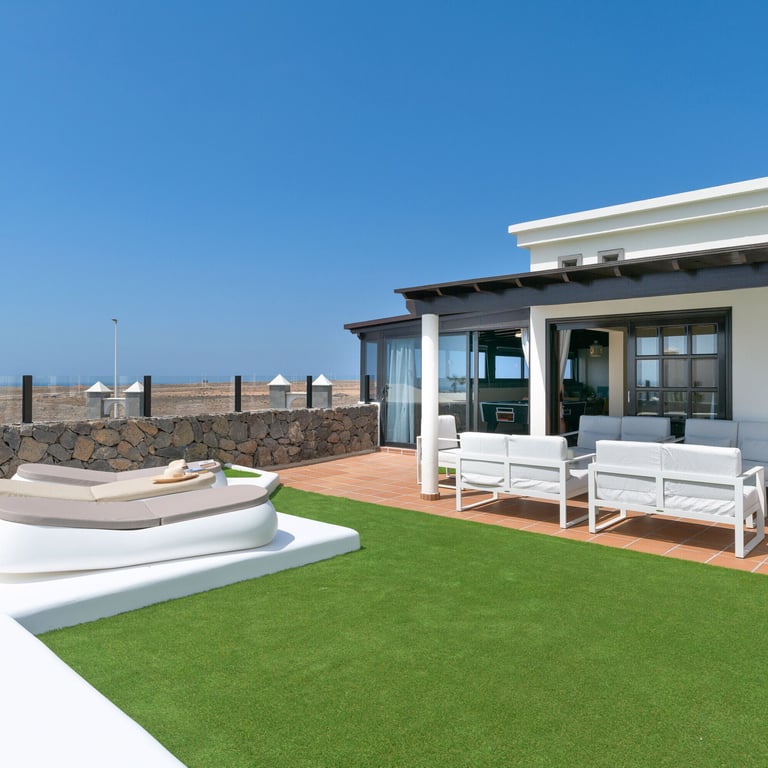 Outdoors amenities include a heated pool with chromotherapy, plus jacuzzi, gardens with fruit trees, and a barbecue area. Multiple terraces (covered and open), along with outdoor bathroom and seating for alfresco dining with views. There is also a multi-sport court (badminton, pétanque, volleyball) in the garden. Guests can explore nearby attractions including Playa Flamingo (15 minutes walk), Playa Blanca (4 minutes drive)and Marina Rubicon (8 minutes drive). The nearest airport Arrecife (ACE-Lanzarote) is 36 minutes drive from the resort.